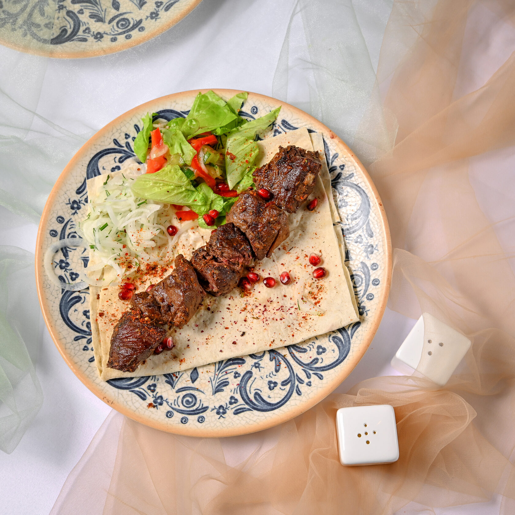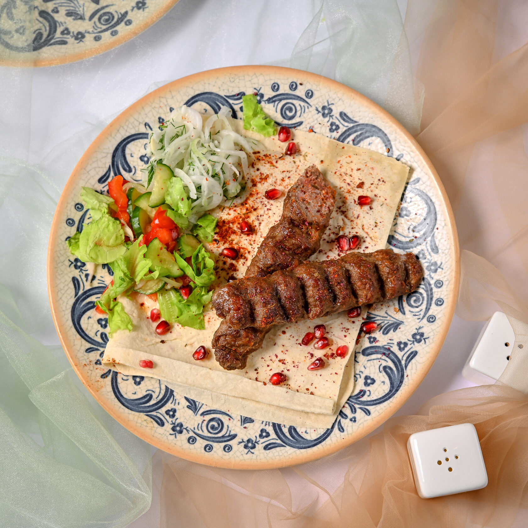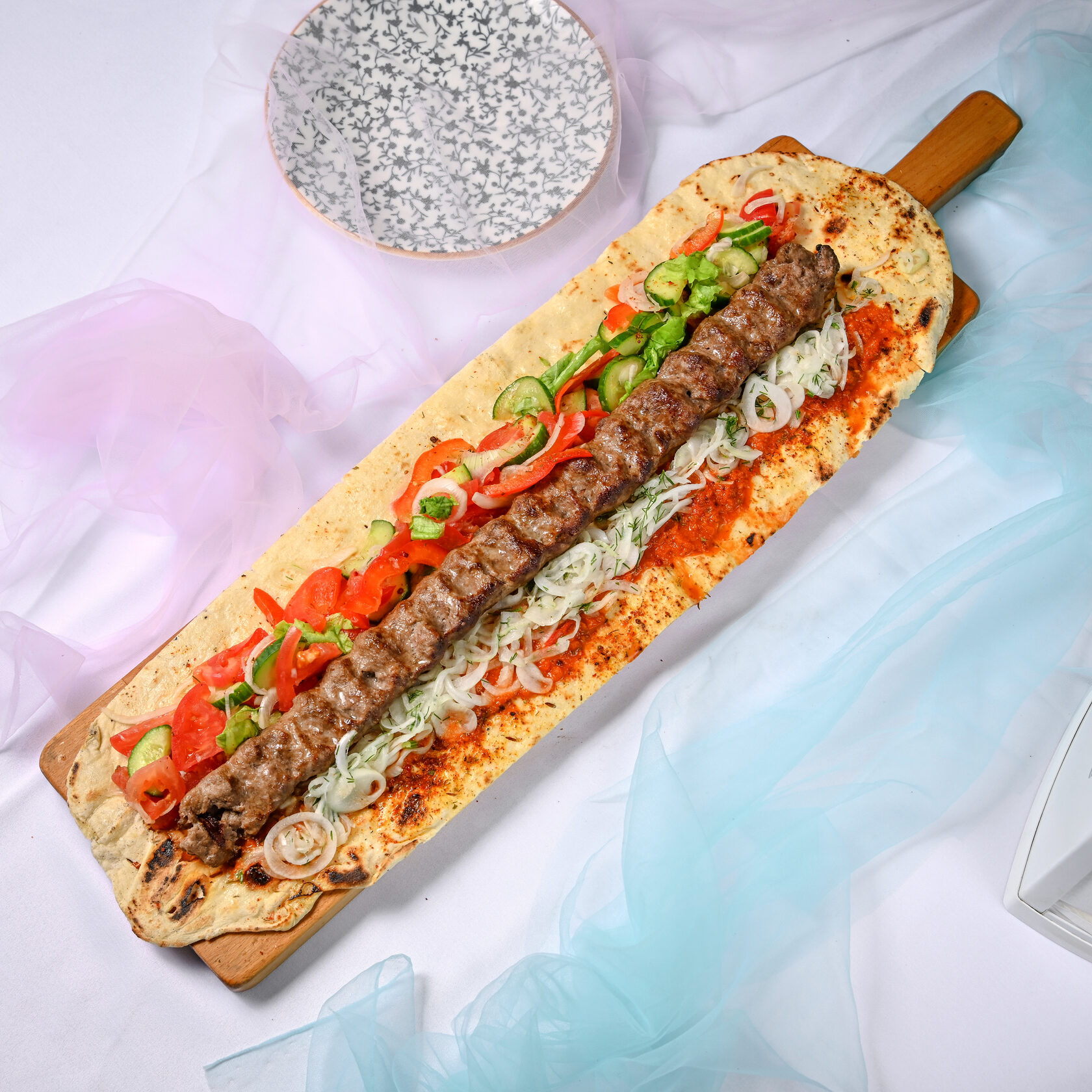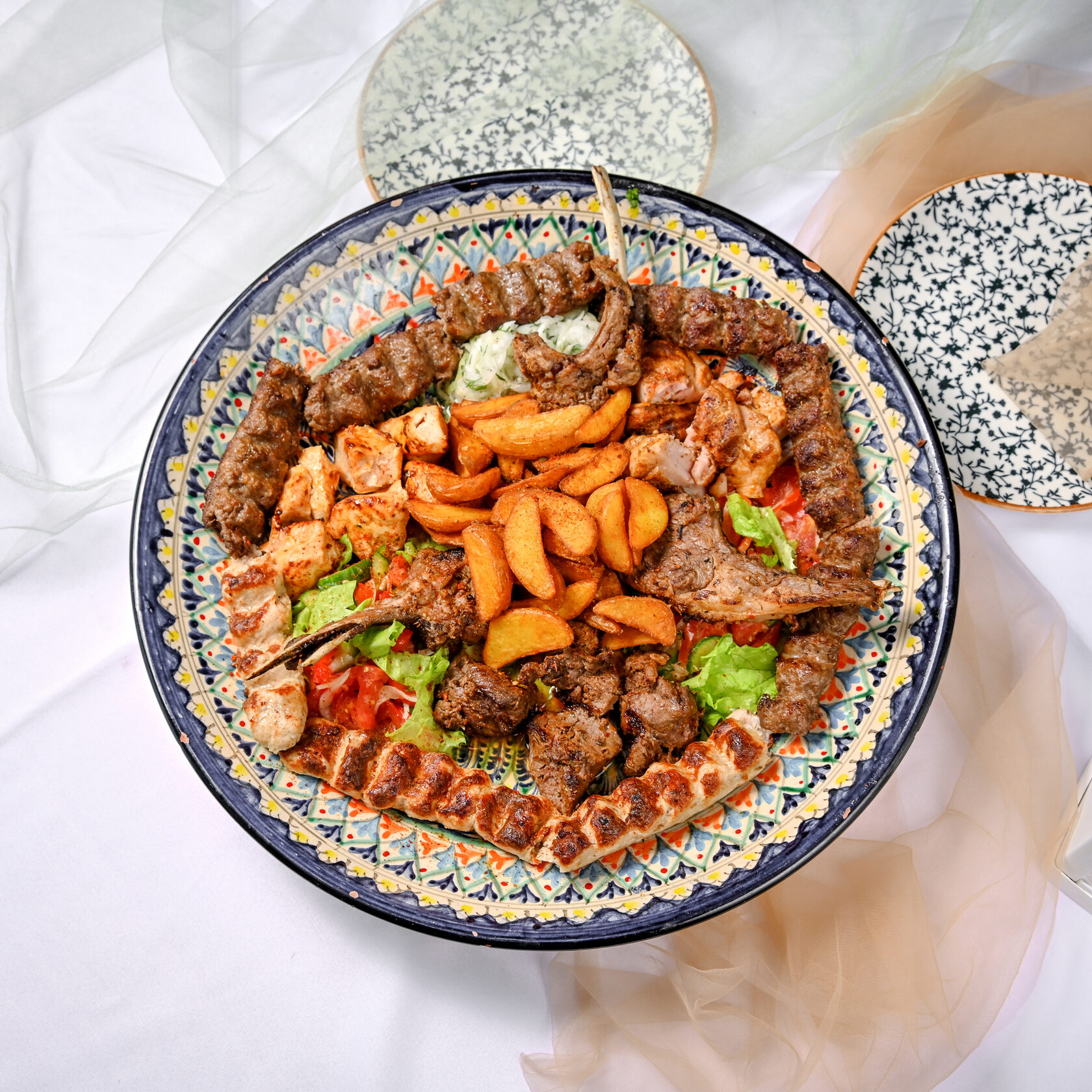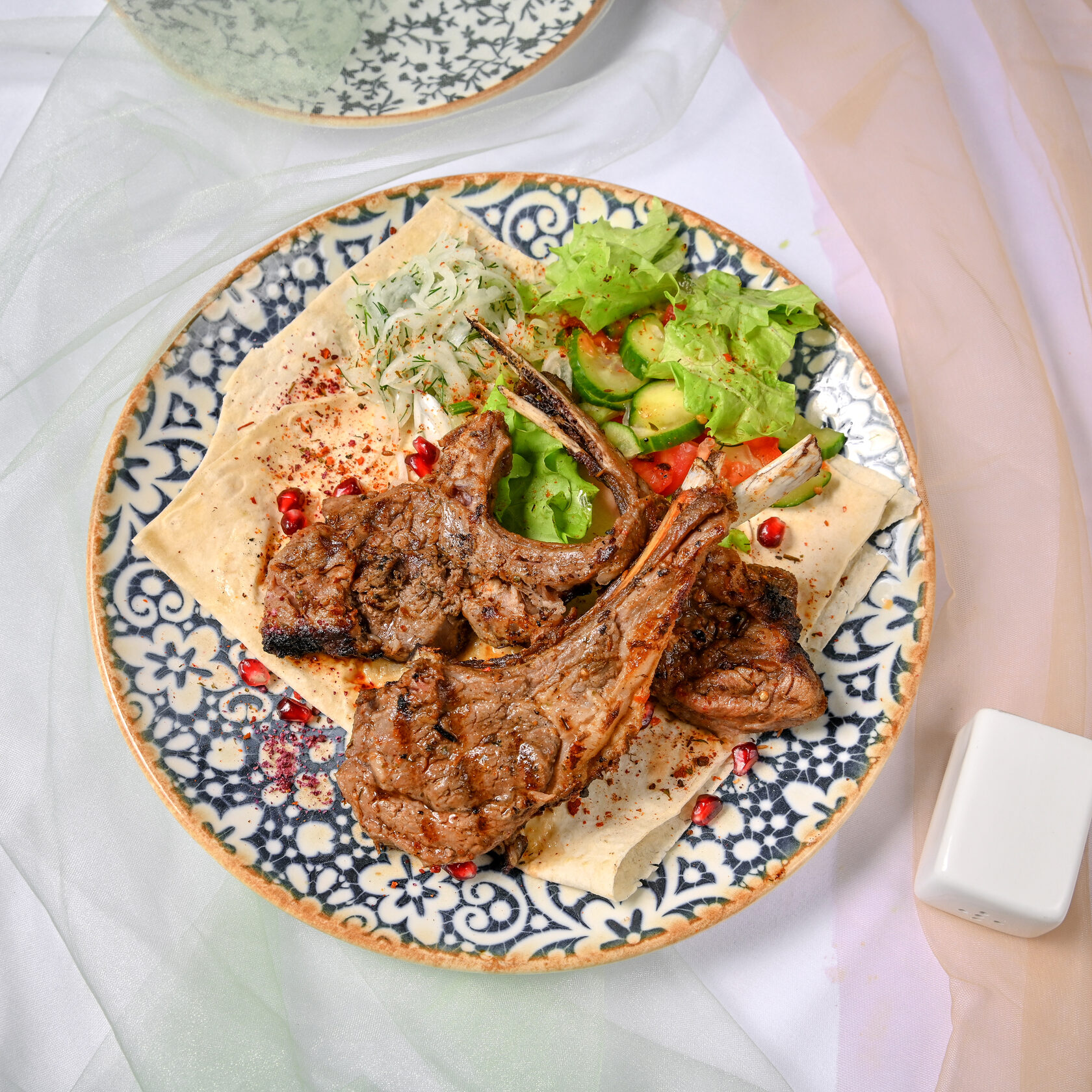 Каре барашка. Шашлыки: индейка, Pin-Up бедро, мякоть барашка. Люля-кебаб: курица, баранина, говядина. Картофельные дольки, маринованный лук, салат из свежих овощей. Подается с соусом тар-тар и домашней аджикой (1,5 кг).