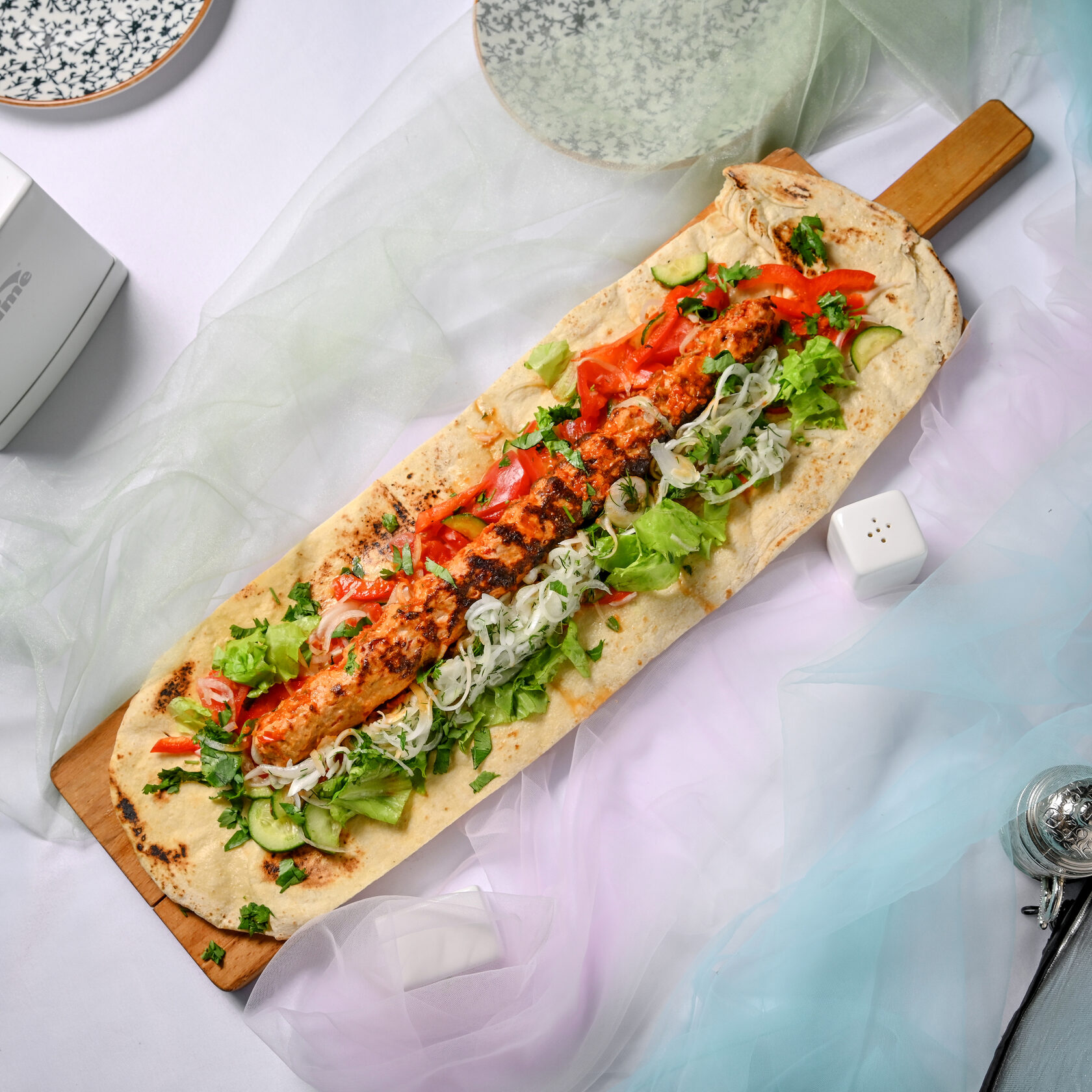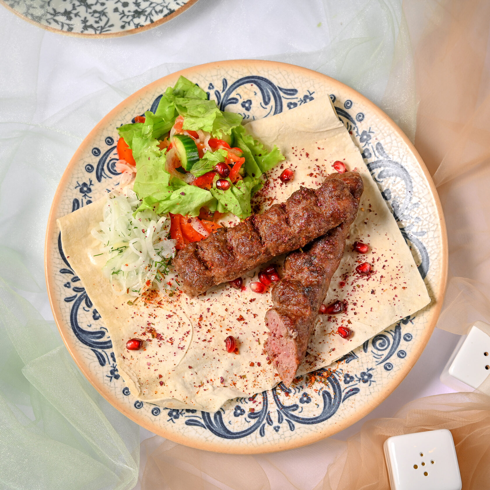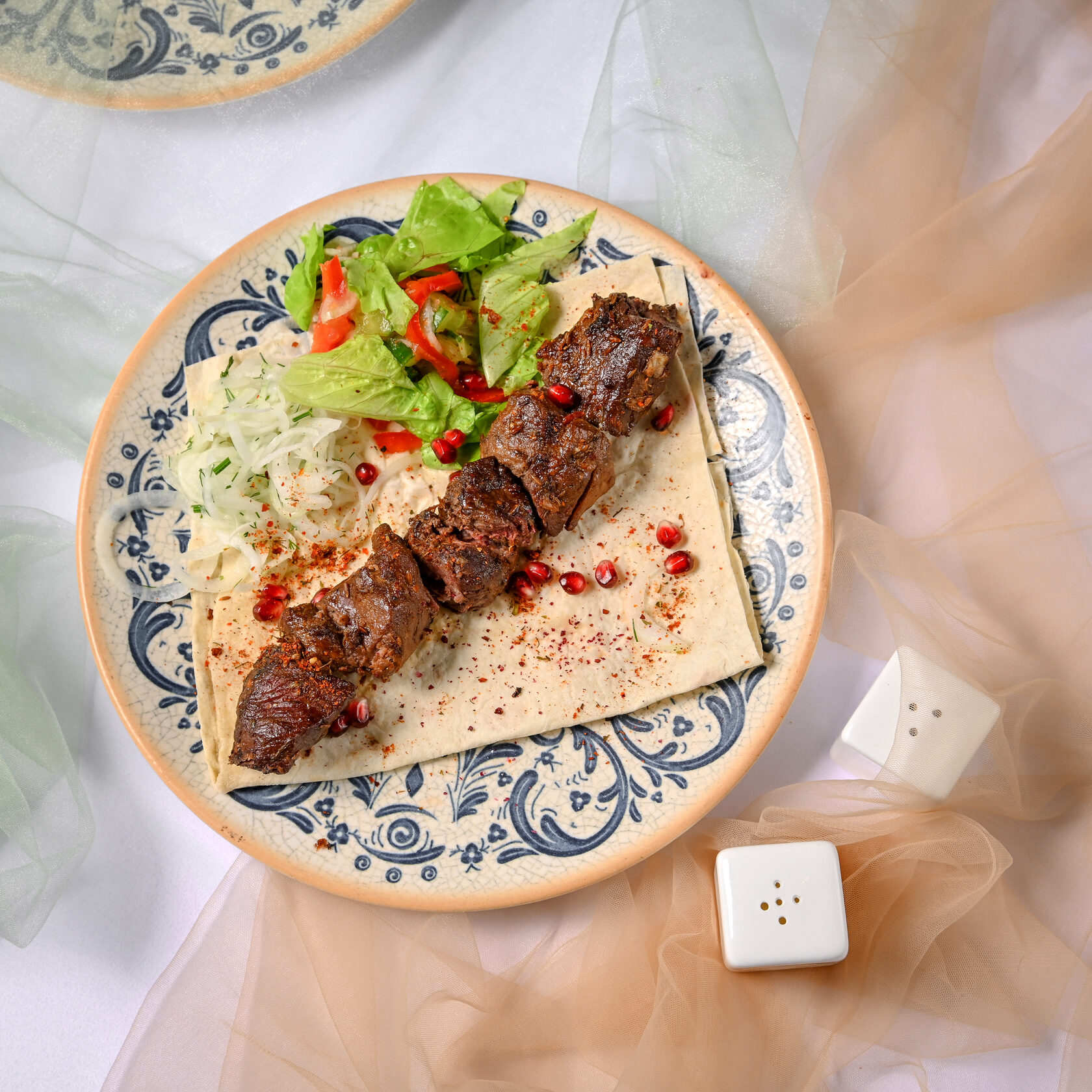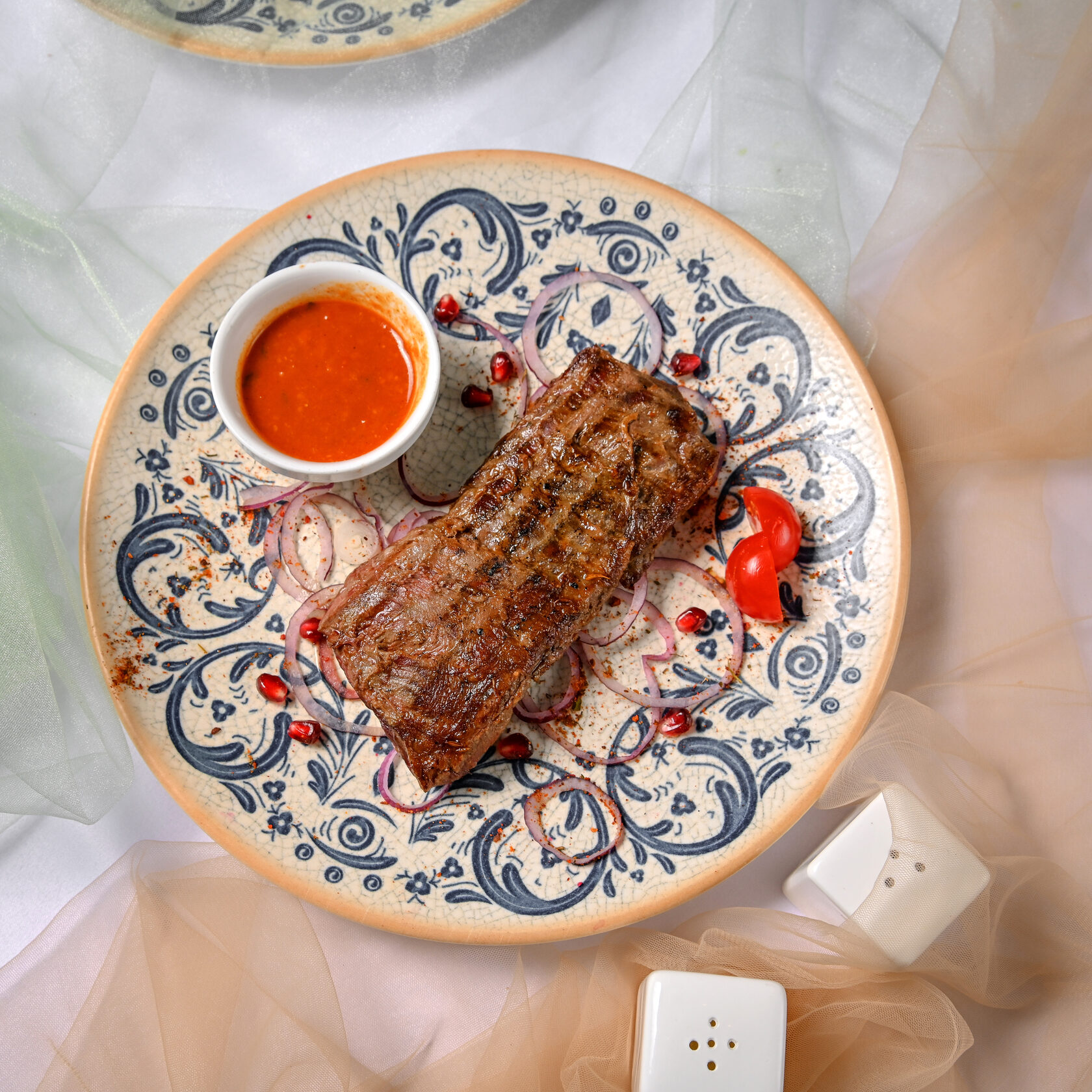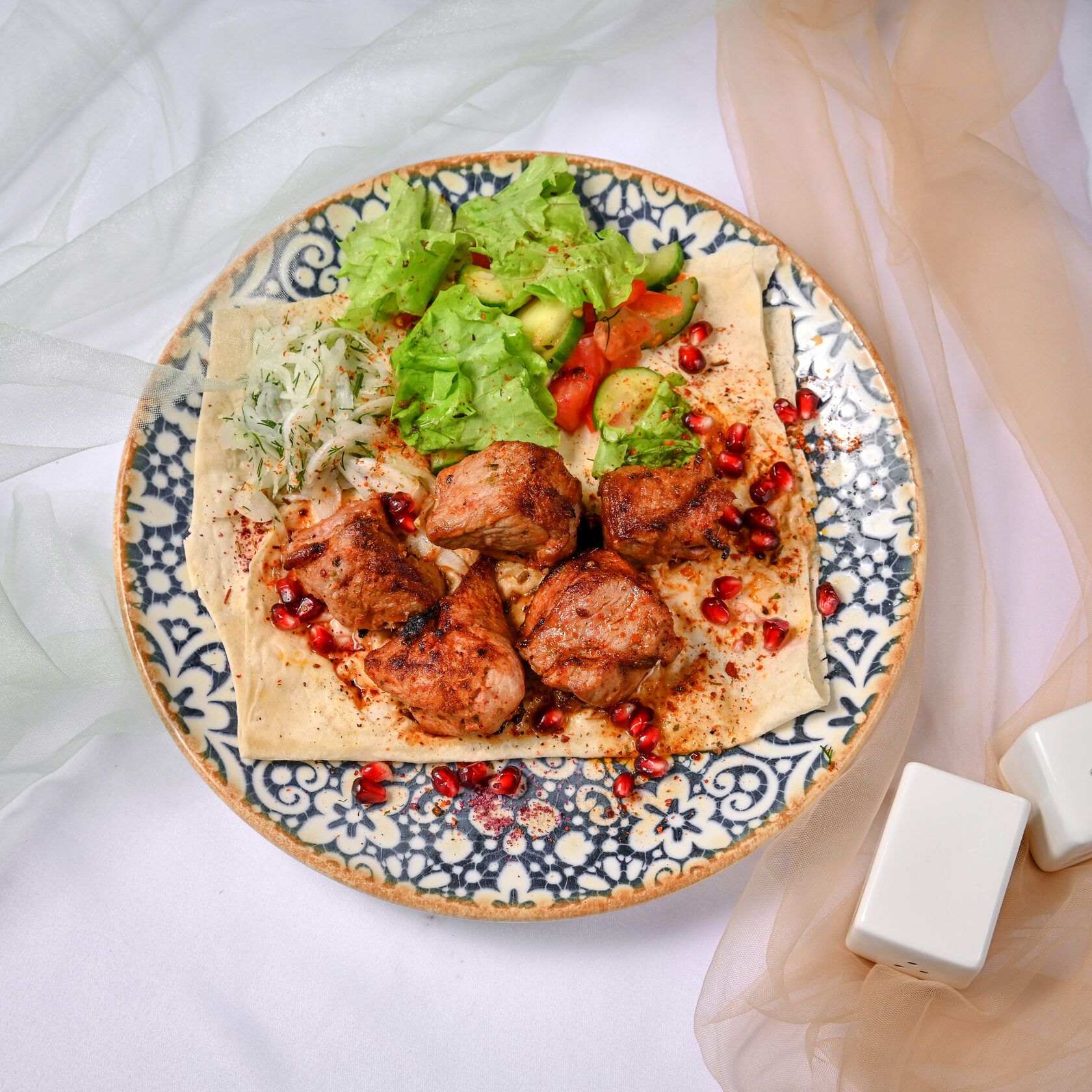 Каре барашка. Шашлыки: индейка, Pin-Up бедро, мякоть барашка. Люля-кебаб: курица, баранина, говядина. Картофельные дольки, маринованный лук, салат из свежих овощей. Подается с соусом тар-тар и домашней аджикой (1,5 кг).